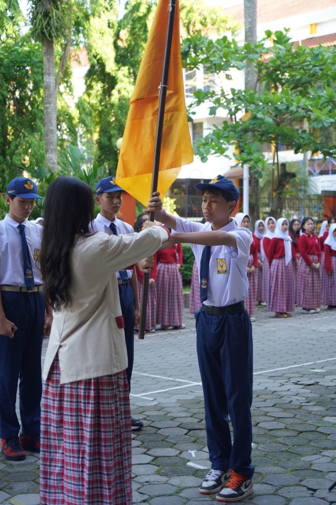 Ket. : Serah terima bendera organisasi dari Calya (Ketua OSIS SMP 2024-2025) kepada Elvano (OSIS 2025-2026)