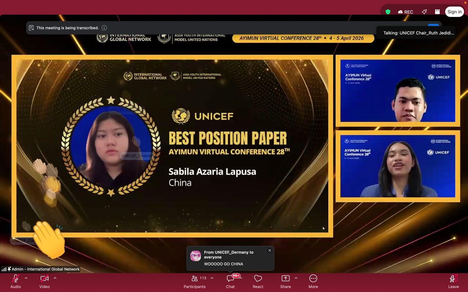 Ket. : Sabila dalam tangkapan layar penghargaan yang diperoleh pada upacara penutupan AYIMUN ke-28
