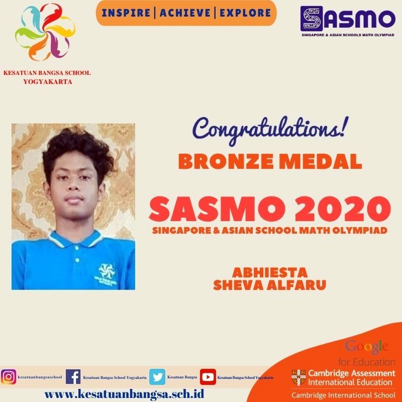 Good news from Olympus (Olympiad Students of Kesatuan Bangsa School) who got medals in Singapore & Asean Schools Math Olympiad (SASMO) which is participated by 19 different countries, on 8 August 2020. Abhiesta Sheva Alfaru – bronze medal in 9 grade category Fathan Achyar Al Matin – bronze