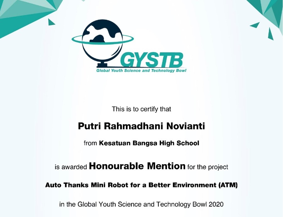 Again, SMP-SMA Kesatuan Bangsa Yogyakarta proofed that online learning did not affect its students in gaining achievements abroad. This time, two students of Kesatuan Bangsa got Honourable Mention in Global Youth Science and Technology Bowl (GYSTB) 2020. They are Khalifathiya Fadhilah