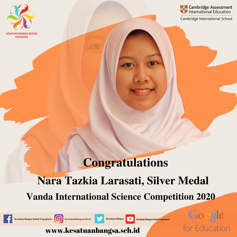 Congratulations to two students of Kesatuan Bangsa School Yogyakarta, Abhiesta Sheva Alfaru (Grade 10D), who won a bronze medal, and Nara Tazkia Larasati (Grade 11B), who won a silver medal at the international science competition,” Vanda International Science Competition 2020” in August.