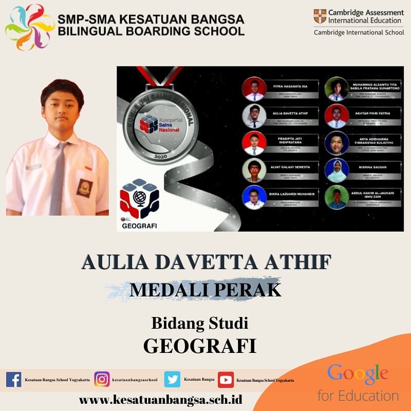 Congratulations for Kesatuan Bangsa school’s students on bringing medals home from National Science Competition 2020 Medals : Earth Science Glady Sajidah – Gold Geography Aulia Davetta – Silver M. Alsamtu – Silver Science Althaaf  Syaikha Nuhaad – Bronze Astronomy M.Hazel Variansyah – Bronze and