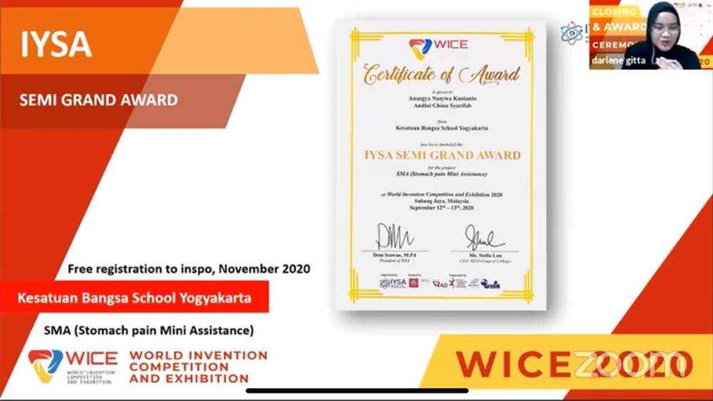 Four Kesatuan Bangsa School students won the international competition held at the Malaysian World Invention Competition and Exhibition (WICE) 2020, September 12-16 2020. The four students are Anargya Nasywa Kustanta and Andini Ghina Syarifah (gold medalists) with the research on Stomach-pain